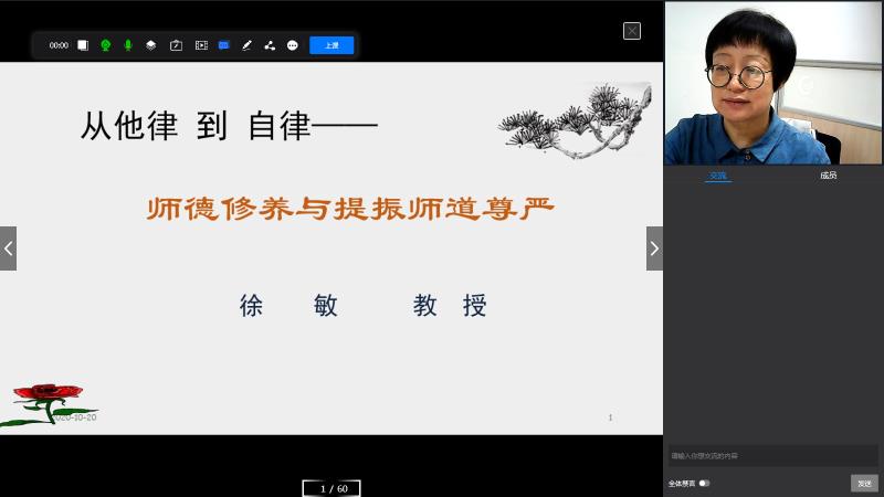 “师以载道,道之所存,师之所存;师以传道,传道授业解惑;师以行道,铁肩担道。”10月20日晚,国家开放大学网络教学核心团队成员、学院教授徐敏通过智慧教室平台为全省电大教师及教育类专业学生开展师德师风专题线上公开课《从他律到自律——师德修养与提振师道尊严》。
