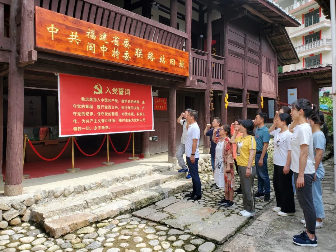 不忘来路,方能知道归处。全体人员来到革命老区基点村——永泰县嵩口镇赤水村。一片绿林掩映,一座淳朴厚重的老宅前竖立着一块褐色石碑,上面刻印着:“中共福建省委闽中特委联络站旧址”。红色题刻凝练一段红色历史。阳光照耀着这座老宅,正如同1944年那个炙热的夏天。1944年6月起,福建省委闽中特委以老宅为联络站,带领赤水村广大群众开展了艰苦卓绝的抗战工作。