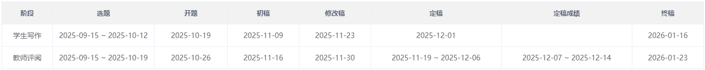 2025年秋季学期本科论文各阶段时间安排表