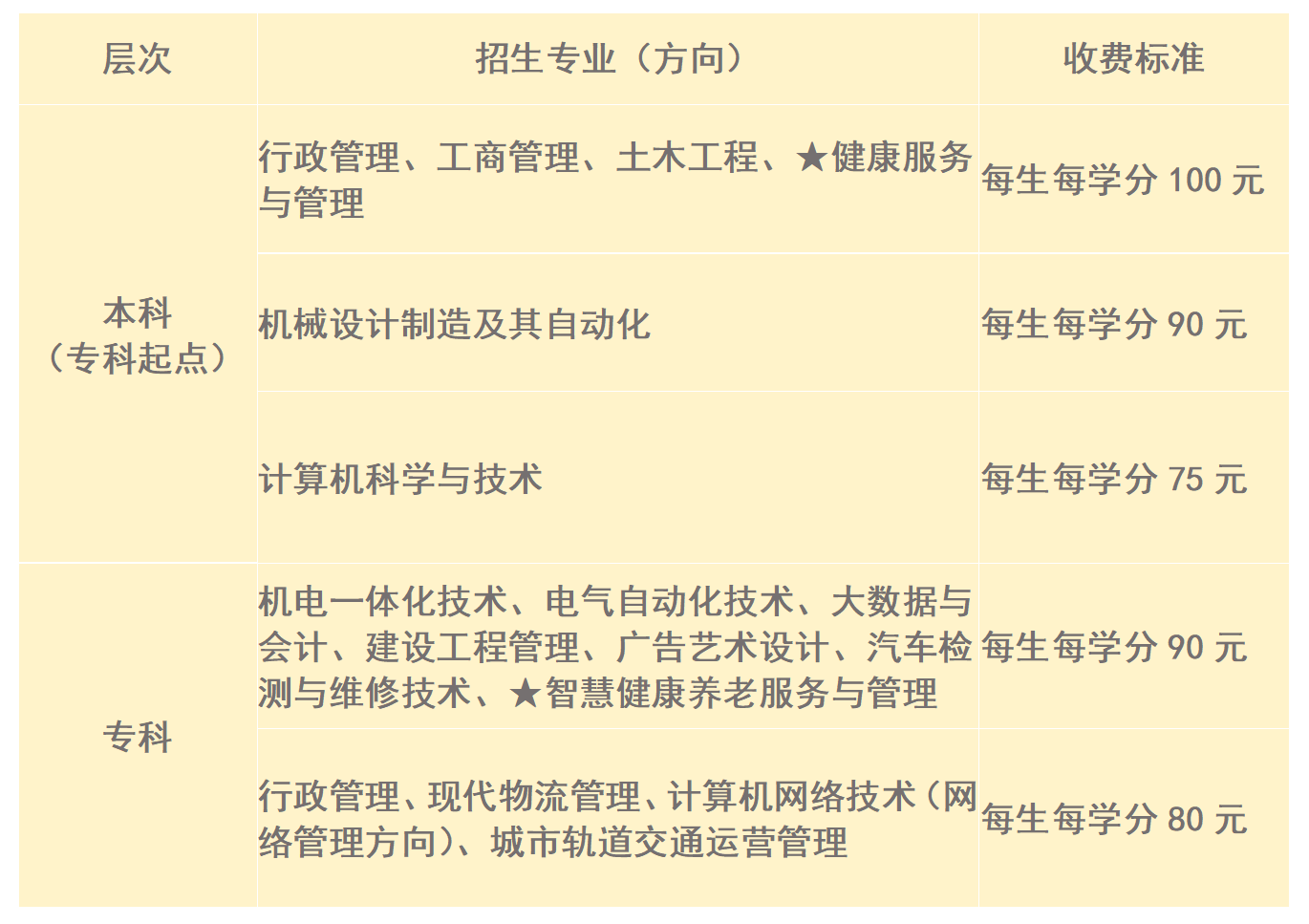 注:加*为自建专业,是由福建开放大学自主建设,面向全国招生的专业。各学院招生专业以实际执行为准。加★专业学分费以最终审批为准。