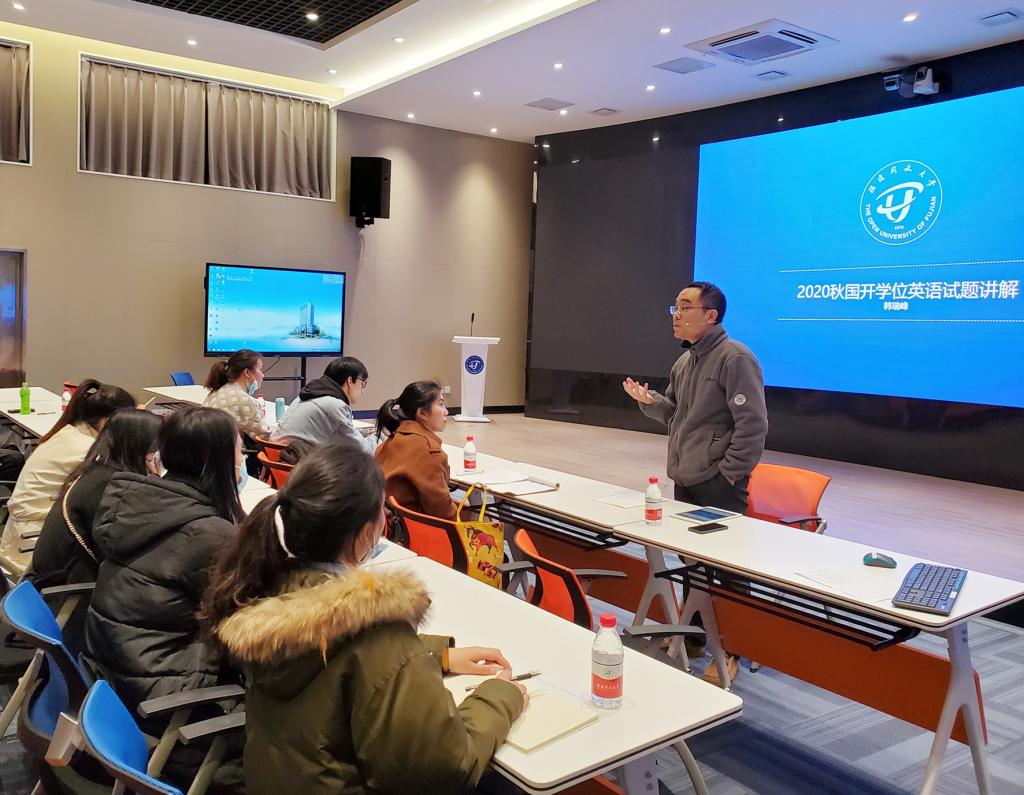 批准他入群的正是学院外语与文化艺术系系主任王小红。此时的她率青年教师韩瑞峰刚从宁德电大送教返回福州。4月24日,恰逢五一假期前最后一个周末,他们应邀匆匆赶赴宁德电大,为即将参加2021年春季学位英语考试的50多名成人在职学生举办两场学位英语辅导讲座,就学位英语考试的现状、试卷结构、备考方式等方面内容进行有针对性的辅导。“很感谢老师们牺牲假期,特地从福州赶来为我们开这个讲座。我们5月15日就要考试了。这次讲座真是太及时,太有用了。”宁德电大工商管理本科学生蔡振键激动不已。