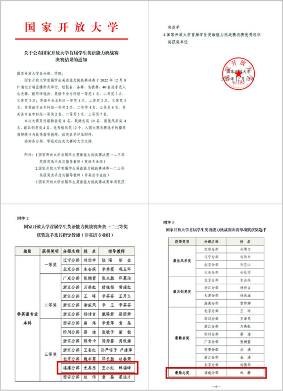 近日,国家开放大学首届学生英语能力挑战赛决赛落下帷幕,此次决赛以线上形式开展,经过口语、写作平台系统AI评分、专家评分等环节的严格筛选,福安开放大学尤品忠同学、福清工作站林静同学最终从全国三千余名参赛选手中脱颖而出,入围总决赛,与来自全国开大系统的众多选手“云端”相聚,同屏竞技,分别斩获非英语专业本科组“三等奖”与“最励志奖”。