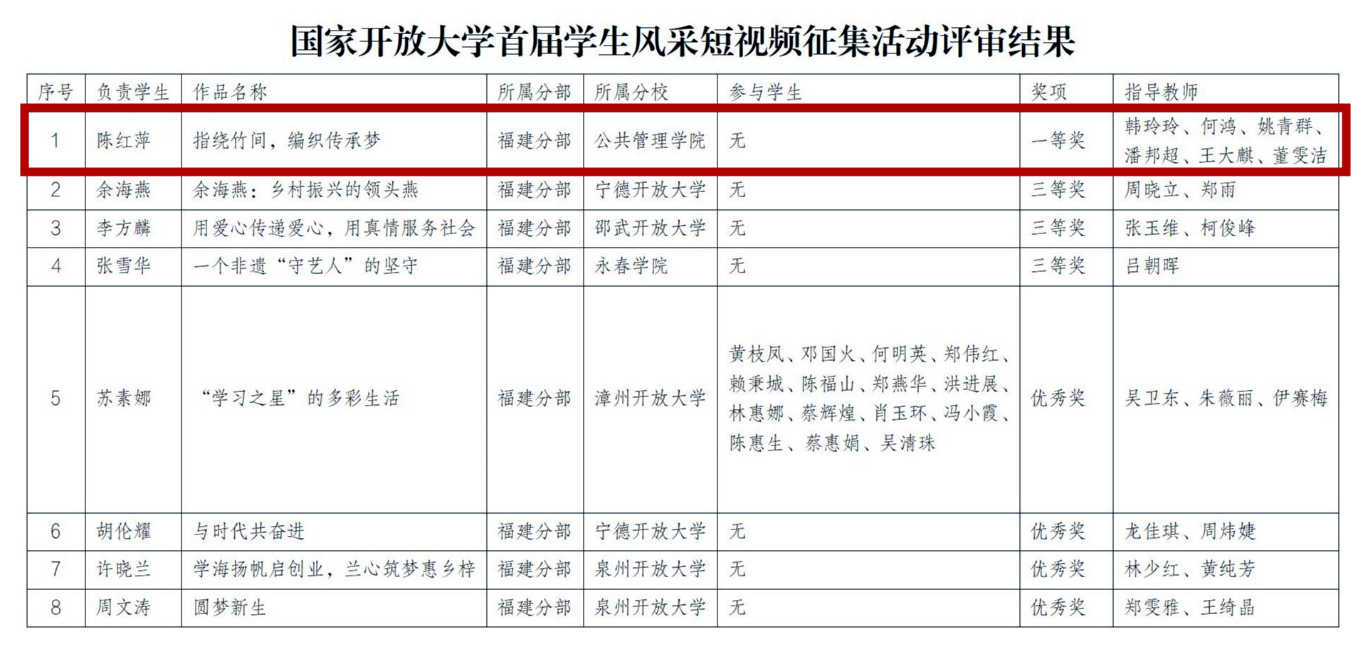 为深入贯彻落实党的二十大精神和习近平总书记关于教育的重要论述,落实立德树人根本任务,展示开放大学育人成果,国家开放大学举办了首届学生风采短视频征集活动。文件下发后,学院认真组织,精心策划、拍摄制作的作品《指绕竹间,编织传承梦》在竞赛中荣获一等奖。
