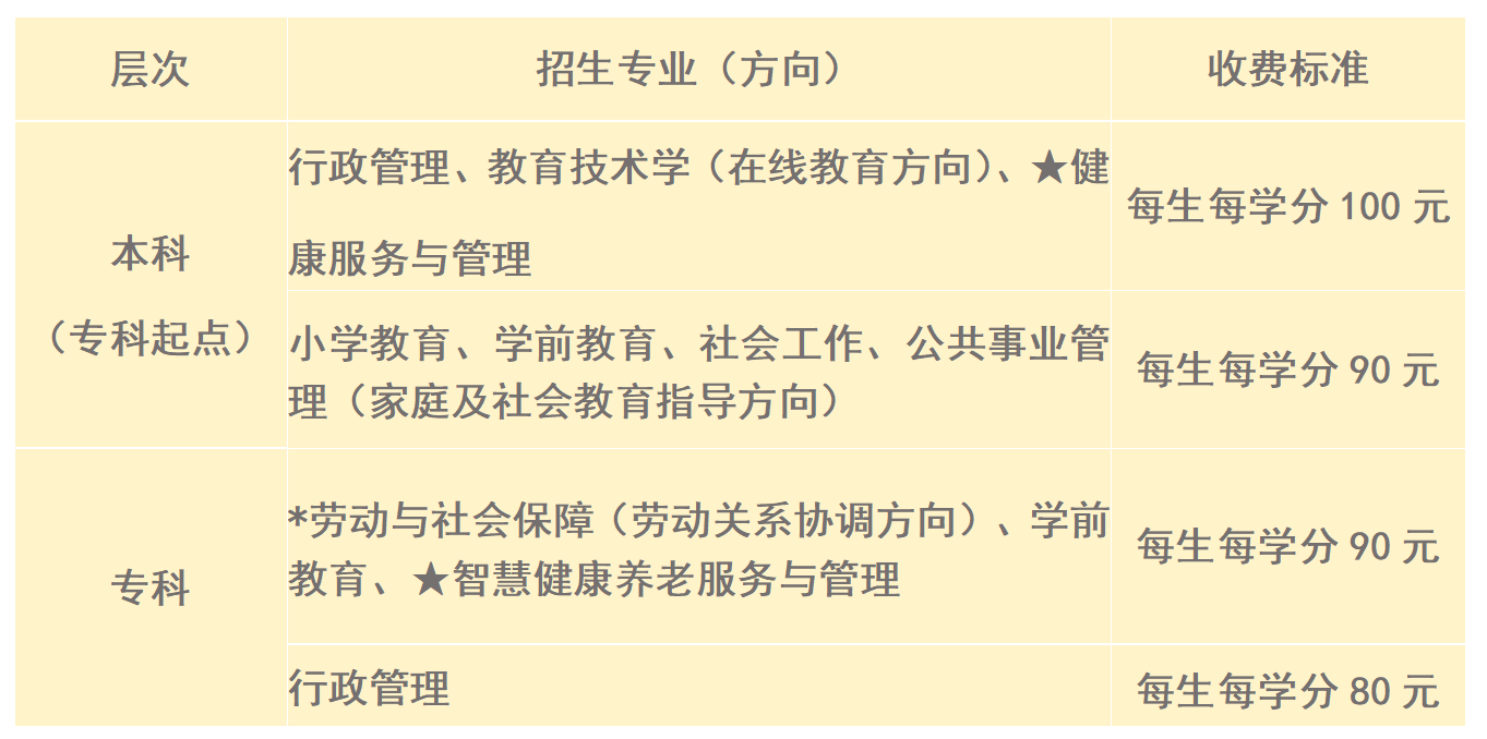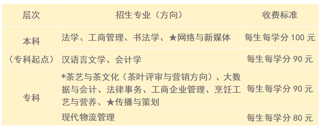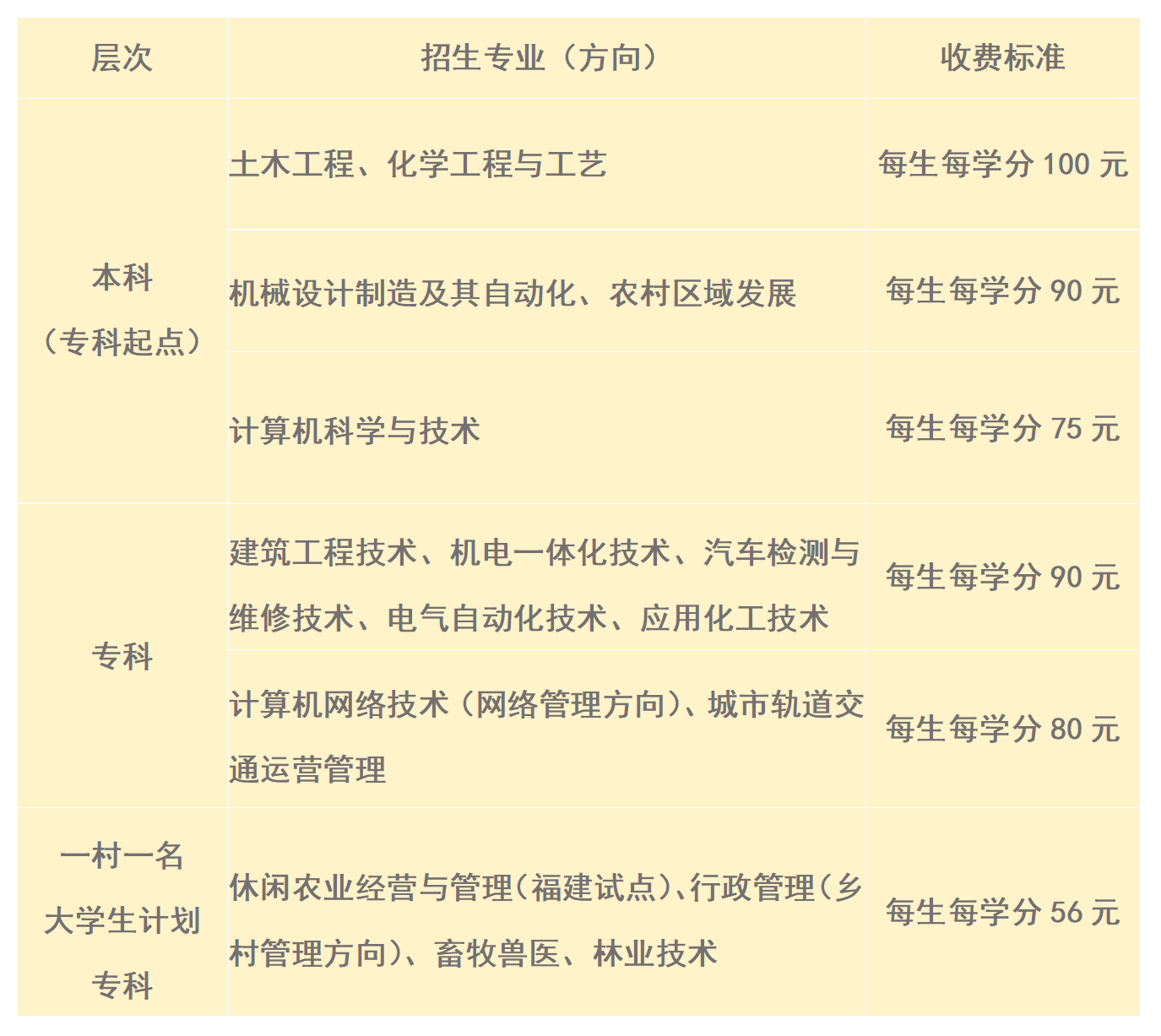 注:加*为自建专业,是由福建开放大学自主建设,面向全国招生的专业。各学院招生专业以实际执行为准。加★专业学分费以最终审批为准。