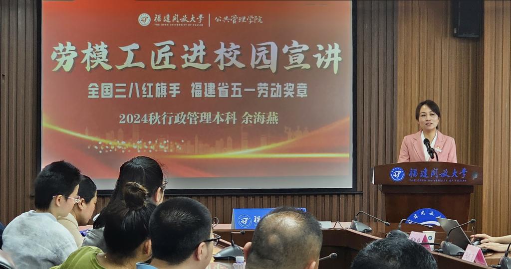 2024秋劳模(工匠)行政管理本科班学生、全国三八红旗手、全国农村青年致富带头人、福建省五一劳动奖章获得者余海燕作为茶菌融合技能大师在新生入学教育活动中分享技艺。她详细讲述了自己扎根茶产业,构筑家乡致富梦的奋斗故事。从2001年跟随父亲学习古田红茶传统技艺,到注册“闽之艳”品牌斩获国内外茶王金奖,从研发“茶菌融合”技术延长产业链,到创办农民田间学校带领村民致富,她用坚守与创新诠释了劳模精神、劳动精神、工匠精神。"在这个快速变革的时代,只有不断学习才能跟上发展步伐,只有持续精进才能实现人生价值。"余海燕的朴实话语赢得现场阵阵掌声。