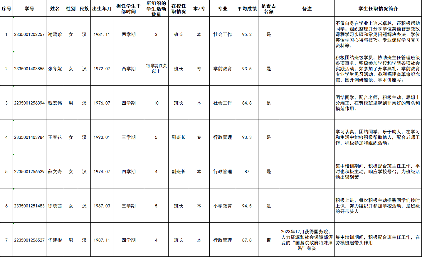 根据福建开放大学《关于开展2024年优秀学生干部评选工作的通知》(闽开大〔2024〕101号),经学院集体讨论、民主推荐,拟推荐以下7名学员为2024年福建开放大学优秀学生干部推荐人选: